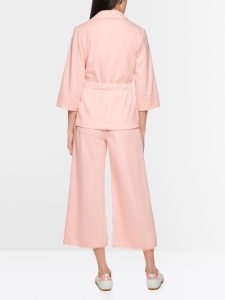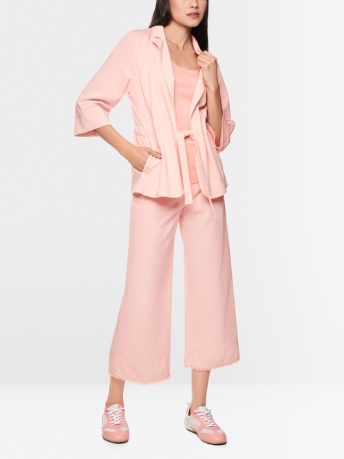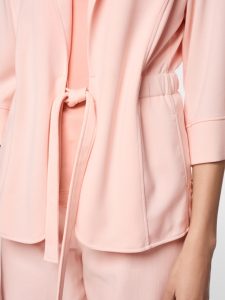 Elegancka marynarka w stylu kimono, dopasowana do sylwetki i z szerokimi, krótkimi rękawami. Szczególnym atutem jest marszczenie w talii, które można regulować gumką. Po bokach znajdują się praktyczne kieszenie. Dzięki miękkiemu materiałowi scuba jersey marynarka jest przyjemna w dotyku i bardzo wygodna w noszeniu. Marynarka jest bez podszewki.