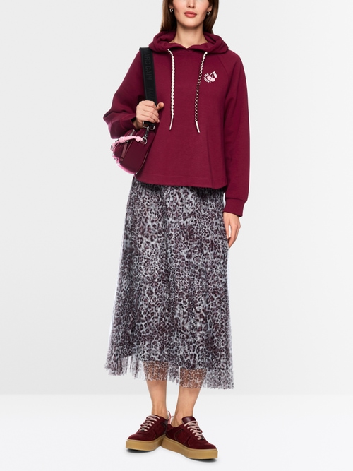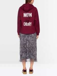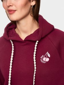 Luźna bluza z kapturem o luźnym kroju i nowoczesnym nadruku. Bluza posiada praktyczny kaptur, raglanowe rękawy i lekko zaokrąglony dół. Nadruk w wiśnie jest mały z przodu i duży z tyłu, ozdobiony cyrkoniami. Dodatkowym detalem jest dwukolorowy, okrągły ściągacz.