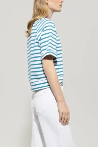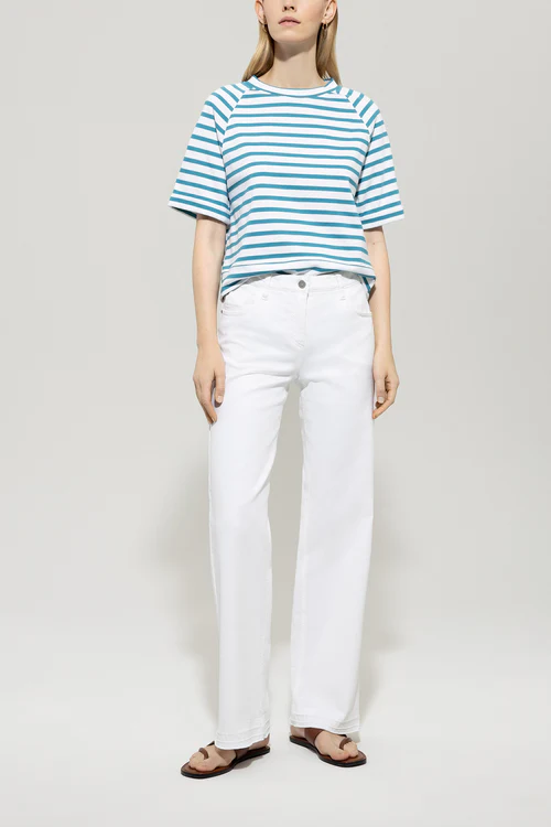 T-shirt z delikatnym wzorem w paski na miękkim, zrównoważonym bawełnianym dżerseju. Swobodna, pudełkowa sylwetka z raglanowymi rękawami jest uzupełniona szerokimi wykończeniami i podwiniętymi końcami rękawów.