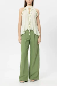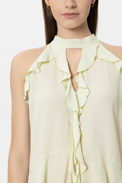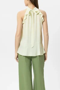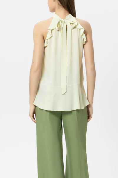 Kobieca, figlarna, lekko rozkloszowana bluzka z lejącej mieszanki jedwabiu z dekoltem w szpic, wyrafinowanymi falbanami boho i peplumem. Ramiączka typu halterneck są wiązane z tyłu jak krawat.