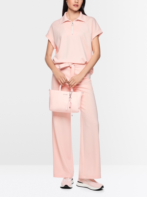 Luźna bluzka z miękkiej mieszanki jersey o luźnym kroju. Koszulka zachwyca luźnym krojem, krótkimi rękawami i kołnierzykiem. Szeroki pas i rozcięcia po bokach dopełniają sportowy look. Kołnierz zapinany jest na zamek błyskawiczny z logo Marc Cain Sports, dzięki czemu można go nosić rozpięty lub jako stójkę.