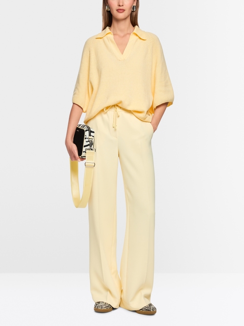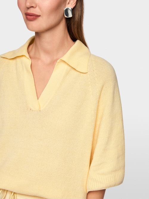 Dzianinowa koszulka polo o modnym, oversize’owym kroju. Koszulka ma obniżone ramiona, kołnierzyk polo i dekolt w serek. Wysokiej jakości mieszanka bawełny i wiskozy zapewnia przyjemną miękkość w dotyku. Produkt jest dziergany w Niemczech: przędze są dziane na najnowocześniejszych maszynach dziewiarskich, a materiały wykańczane w Niemczech. Poszczególne elementy, takie jak rękawy, przód itp., są zszywane w europejskich firmach partnerskich.