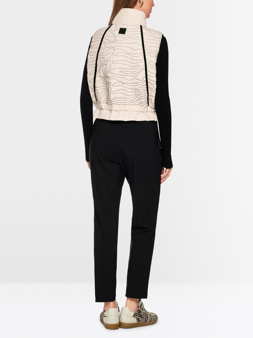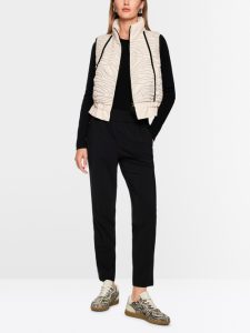 Pikowana kamizelka z falowanym pikowaniem i specjalnymi szwami. Luźny krój nadaje kamizelce nowoczesny charakter. Podkreśla go dodatkowo gumka w pasie i rząd falban. Pikowana stójka zapewnia ciepło w chłodniejsze dni. Boczne kieszenie dopełniają całości. Kamizelka zapinana jest na zamek błyskawiczny.