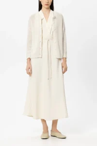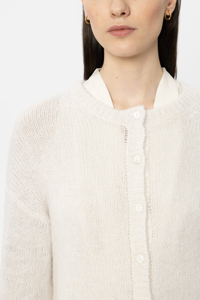Kardigan o pudełkowym kroju wykonany z mieszanki alpaki i wełny z okrągłym dekoltem, opadającymi ramionami i zapięciem na guziki na całej długości. Proces przędzenia na powietrzu sprawia, że przędza jest wyjątkowo lekka, miękka i puszysta.