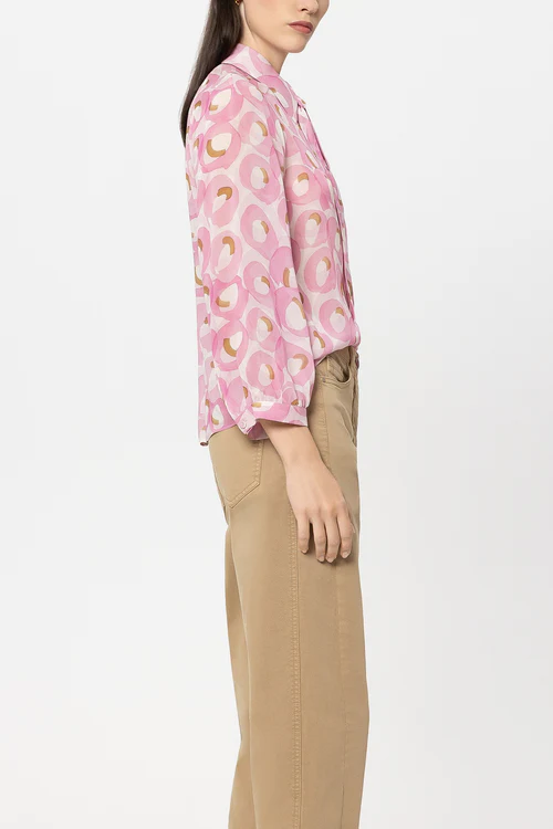 Półprzezroczysta bluzka koszulowa z lejącej krepy wiskozowej z ekskluzywnym nadrukiem retro, klapą i balonowymi rękawami. Guziki na mankietach i plisie guzikowej są pokryte materiałem.