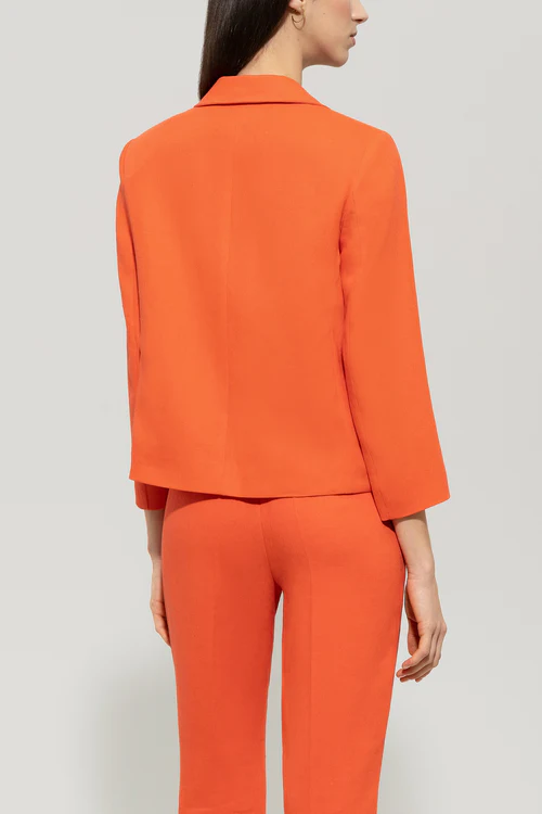 Marynarka wykonana z drobno tkanej mieszanki lnu i wiskozy o lekko przyciętej, prostej sylwetce. Ten klasyczny fason z kołnierzem klapowym i naszywanymi kieszeniami z patkami jest zapinany z przodu na dwa pokryte tkaniną guziki.