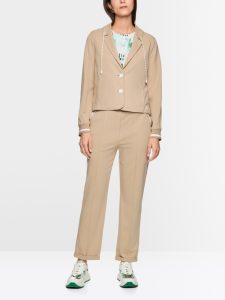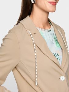 Nowoczesna, sportowa marynarka o krótkim, prostym kroju, wykonana z bawełny, modalu i elastanu. Głębokie klapy i zaokrąglony dół dodają kobiecego charakteru. Dwa guziki i kieszenie boczne dopełniają stylizację. Sznurek przy kołnierzu i kontrastowe paski na mankietach i u dołu z tyłu dodają sportowego charakteru.