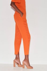 Lekko przycięte spodnie z drobno tkanej, lejącej mieszanki lnu ze zwężanymi nogawkami i prasowanymi zakładkami. Spodnie mają rozcięcie po bokach i są wyposażone w dwie kieszenie boczne oraz dwie atrapy kieszeni tylnych z patkami.
