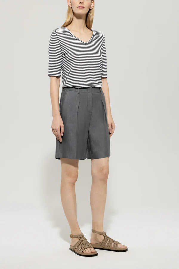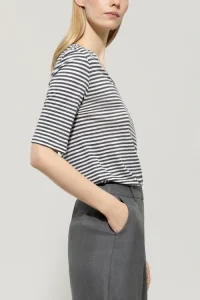 T-shirt wykonany z cienkiej, letniej tkaniny lnianej z wzorem w paski, dekoltem V i rękawami o średniej długości. Tył zdobi subtelny nadruk na karku.