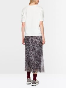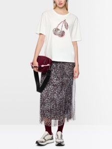 Swobodny T-shirt z nowoczesnym nadrukiem. Ten model ma w dużej mierze klasyczny krój z okrągłym dekoltem i krótkimi rękawami. Uwagę przyciąga nadruk z wiśniami w panterkę.