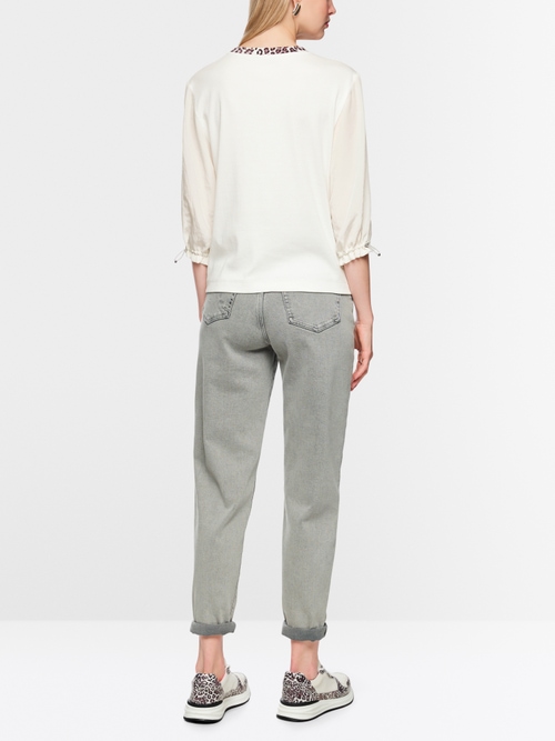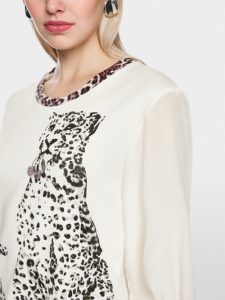 Ta bluzka-koszula wykonana jest z modnego połączenia materiałów i zachwyca wyjątkowym nadrukiem. Ma luźny krój z rękawami o długości 3/4. Okrągły dekolt i przód koszuli zdobi nadruk w panterkę. W przeciwieństwie do reszty koszuli, rękawy wykonane są z lejącego materiału z elastycznymi mankietami.
