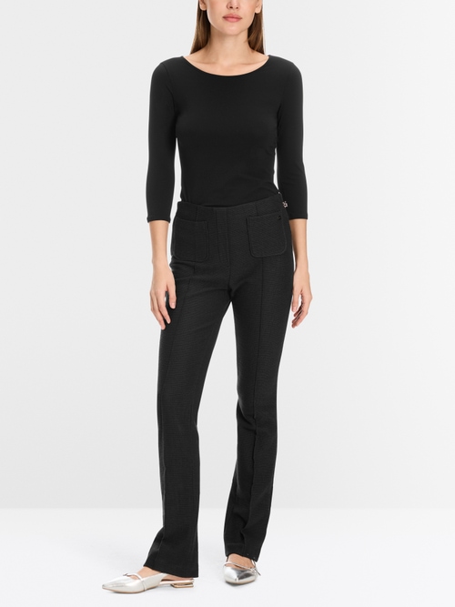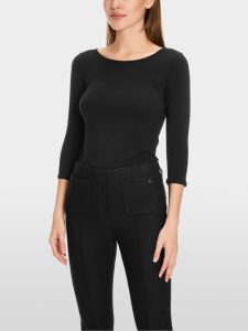 Wysokiej jakości koszula z długim rękawem marki Marc Cain, wykonana z najwyższej jakości elastycznego materiału, niezwykle miękkiego w dotyku i dyskretnie dopasowanego. Ten uroczy, niezbędny element garderoby dopełnia szeroki, zaokrąglony kołnierz oraz podwójne pikowanie przy mankietach i u dołu.
