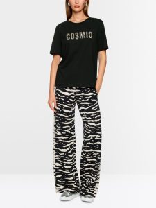 Swobodny T-shirt z nowoczesnym nadrukiem. Ten model ma w dużej mierze klasyczny krój z okrągłym dekoltem i krótkimi rękawami. Uwagę przyciąga zwierzęcy nadruk z hasłem Cosmic Love. Koszulka jest wykonana z bawełny organicznej i ma certyfikat zrównoważonego rozwoju „Rethink Together”.