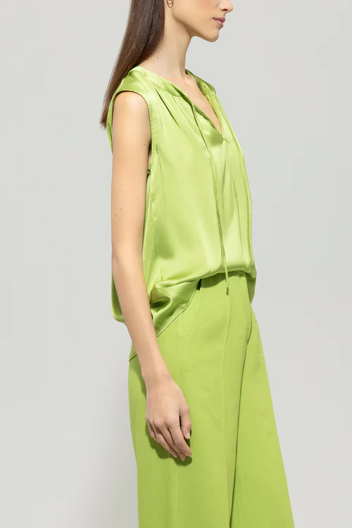 Bluzka bez rękawów wykonana z ciężkiego jedwabiu techno. Dekolt ma urocze marszczenia i dwa wiązania.