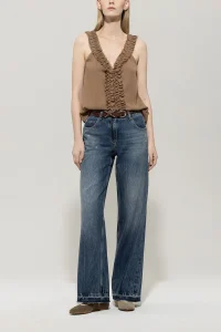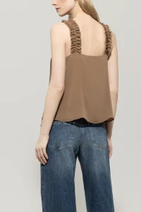 Dwuwarstwowy top typu camisole o delikatnej fakturze krepy. Delikatna aplikacja z falbanek na ramiączkach i dekolcie podkreśla swobodną, rozkloszowaną sylwetkę.