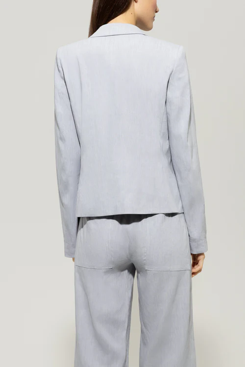Marynarka zapinana na jeden guzik, wykonana z mieszanki lnu i wiskozy w specjalnym kolorze. Smukły, dopasowany krój ma klasyczny kołnierz klapowy i dwie wskazane kieszenie z przodu.